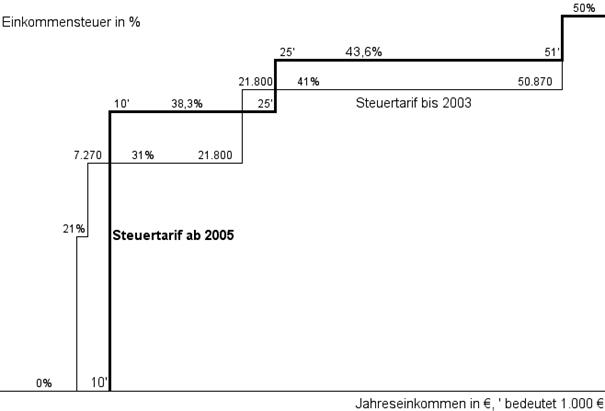 Falls Sie an der Berechnung Ihrer Einkommensteuer interessiert sind: der ab 2005 gültige Einkommensteuertarif lautet: